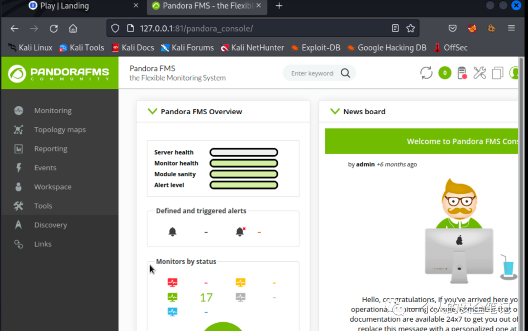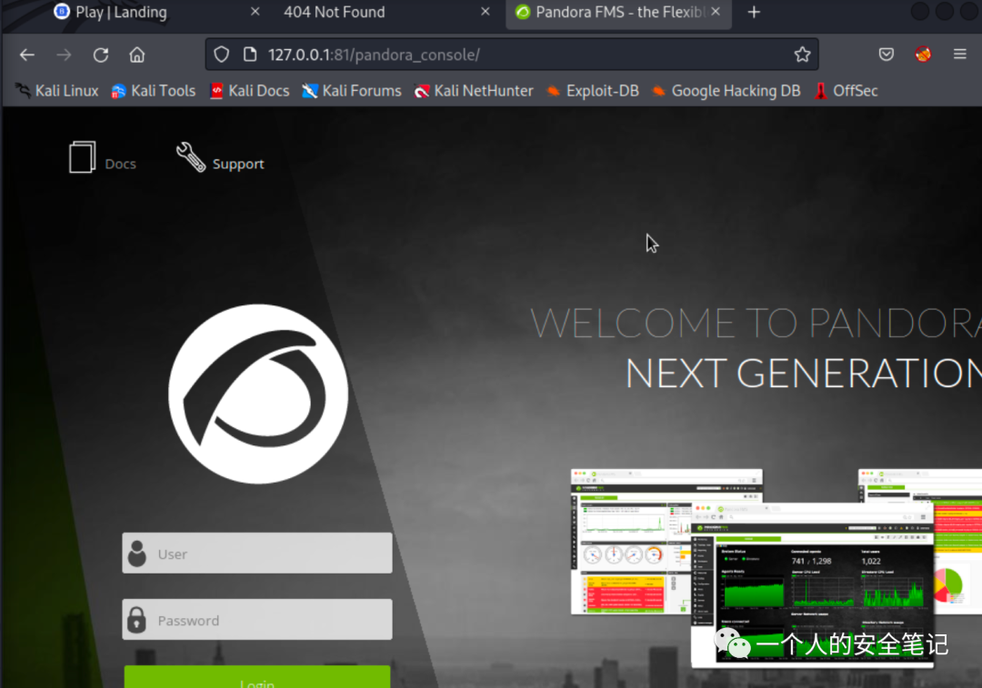 根据源代码内容信息获悉这是 Pandora FMS 服务(Pandora FMS 又称 “Pandora Flexible Monitoring System”,是一款用于服务器、网络、应用和虚拟基础设施的监控工具),在根据版本信息进行历史高危漏洞的查找,发现存在 RCE 漏洞但需要具备登录会话。