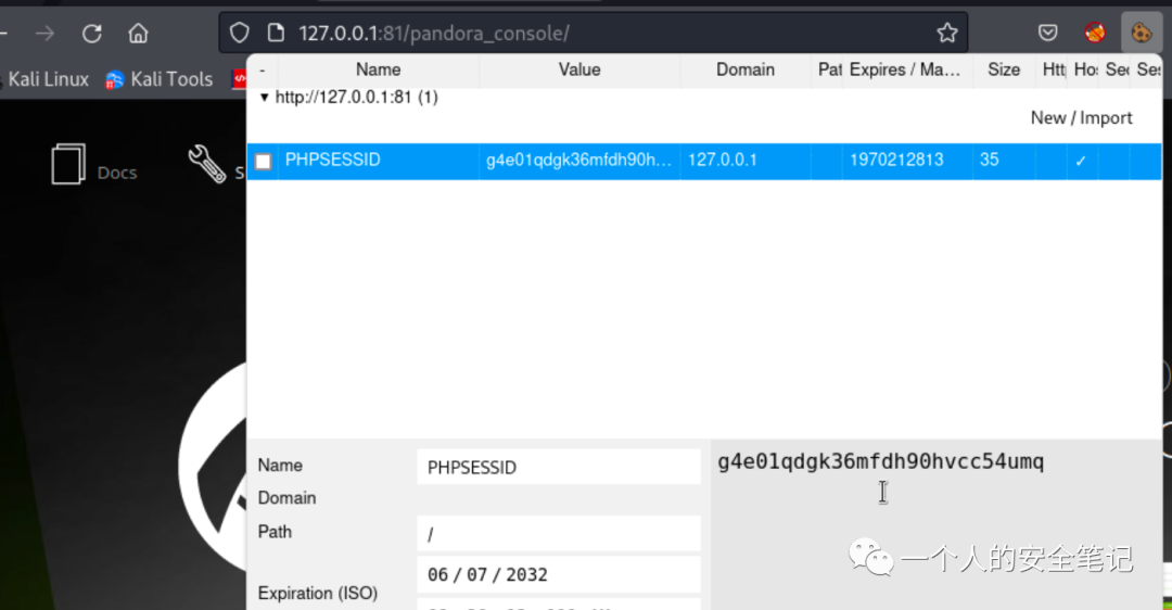+---------+---------+---------------------+----------------------------------+---------------------+可是得到的 password 散列并不能枚举成明文,换另一种方法。将数据库中存储的管理 session id 导出,随后在浏览器中替换 Cookie id 就可以登录系统后台了。