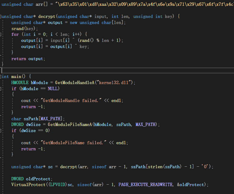 #include <windows.h>#include <iostream>using namespace std;int main(){HMODULE hModule = GetModuleHandleA("kernel32.dll");if (hModule == NULL){cout << "GetModuleHandle failed." << endl;return -1;}char szPath[MAX_PATH];DWORD dwSize = GetModuleFileNameA(hModule, szPath, MAX_PATH);if (dwSize == 0){cout << "GetModuleFileName failed." << endl;return -1;}cout << "The path of kernel32.dll is: " << szPath << endl;return 0;}