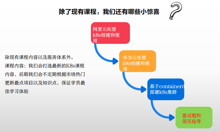K8s更是一项代表未来的技术!国内已经有百度、小马智行和AutoX等公司应用了K8s+istio的Sidecar设计模式,在公开道路上进行了无人驾驶车辆运行。国际上已经有K8s在智能城市的应用,超过3000个端点以及大约300个IoT网关以高可用模式运行在K8s驱动的容器中,并通过数据API为第三方公司提供交通、监控、能源、营销、旅游、环境等信息。我们的课程主要分四大模块,课程内容定期更新,讲师还会为大家整理错题笔记,在群里答疑指导,安排1v1远程服务,学员满意度高,学完后收到高薪offer的比比皆是。第一模块主要围绕K8s基础讲解,介绍K8s容器运行时Docker,学习Docker的目的就是让大家对容器概念、用法、思想有进一步的了解,帮助大家顺利过渡到K8s。Docker介绍之后会从K8s核心技术点、生产环境K8s安装步骤入手,带领大家入门K8s,搭建起来K8s集群环境,为接下来学习打好基础。第二模块主要是围绕K8s核心技术和企业应用进行讲解,通过对K8s核心资源Pod、控制器、四层代理、数据持久化、RBAC认证授权、Ingress-Controller七层代理及高可用方案、多租户隔离等方面进行深入分析和实际案例演示,结合企业具体环境在K8s集群部署线上业务,让大家能全面了解K8s的用法及企业运维能力。第三模块主要是对企业真实案例进行全方位讲解,通过世界500强真实项目,让大家对K8s有进一步认识,能达到运用前面学习的基础知识,结合自己公司实际业务场景,能把K8s灵活使用起来,具体讲解内容主要包括:基于Prometheus+Grafana+Alertmanager构建智能化监控告警系统、基于EFK+logstash+kafka构建高吞吐量的日志收集平台、基于云原生分布式存储Ceph实现K8s数据持久化;基于Jenkins+K8s+gitlab+nexus+harbor+SpringCloud构建DevOps自动化运维管理平台、最新一代微服务网格Istio入门到企业实战、Rancher管理K8s最新版本高可用集群、阿里云和华为云托管K8s使用。第四模块主要是针对CKA认证进行专项练习,通过对CKA考试报名流程、题库练习,让大家可以快速拿下CKA认证,CKA考题部分会讲解很多企业实战案例,如K8s版本升级、ETCD备份还原等,让大家既能掌握技术,又能拿到证书,提升自己的软实力,为面试升职加薪做准备。如果你属于下面这四类人任何一种,那就赶紧加入直播训练营吧!第一类:想要学习K8s的运维、开发、测试、售前、DevOps工程师、架构师等技术人员,或相关专业大学生;第四类:想要学习DevOps体系、监控、链路监控、日志、持久化存储、微服务、二次开发的人员。3天课程会介绍K8s架构、组件、核心资源、应用领域、大厂真实案例,带你实战练习基于K8s的DevOps、微服务、EFK等世界500强真实项目。而且听完课,就可在群里向韩先超老师提问,有问题当堂解决,非常高效!这个课程非常适合想要学习和了解K8s的同学。![]()
