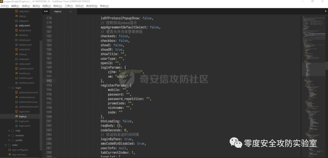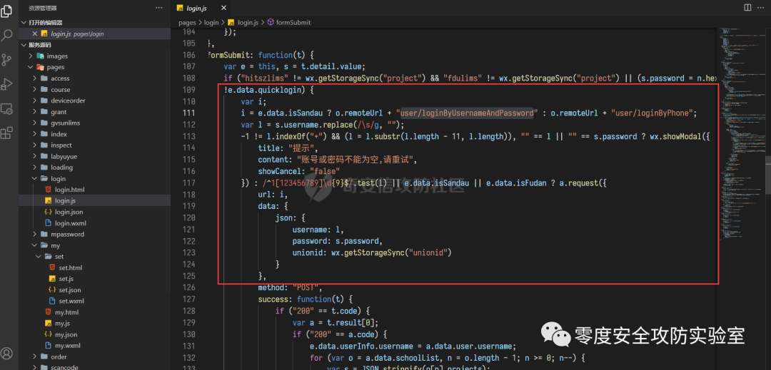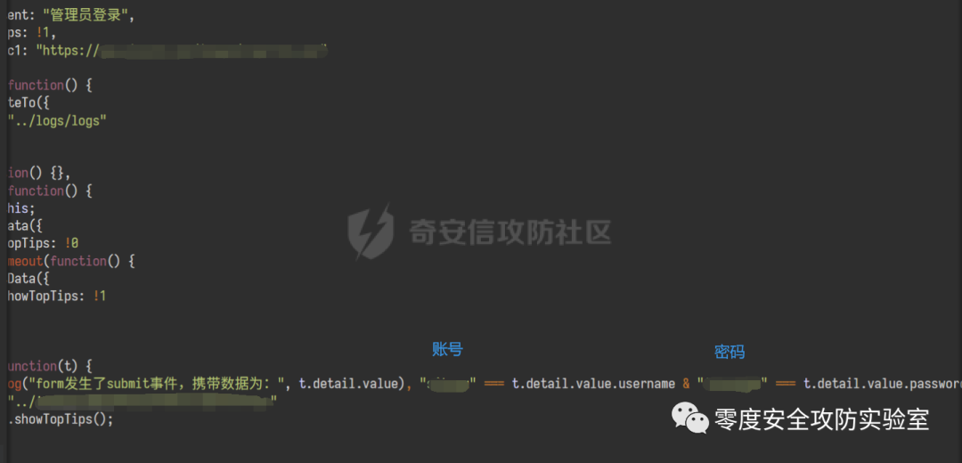 反编译出来的源码泄露登录账号密码,这里是因为在 js 文件中写死了账号密码,只做了前端验证导致的漏洞,从下面贴的两个小程序源码中可以看到