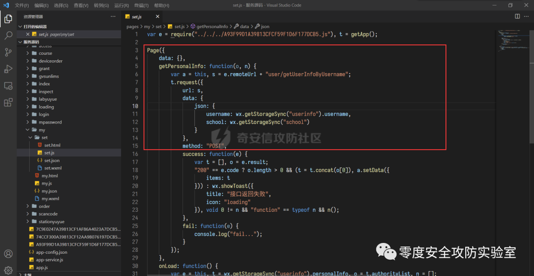 举例某小程序审计,在登录界面爆破无关之后,直接反编译拖源码审计一下,反编译出来的源码,我们着重看 js 文件及其配置文件即可。第一想法就是先找一些接口,尝试是否有未授权之类的漏洞,下面就是找到的一处路由user/getUserInfoByUsername