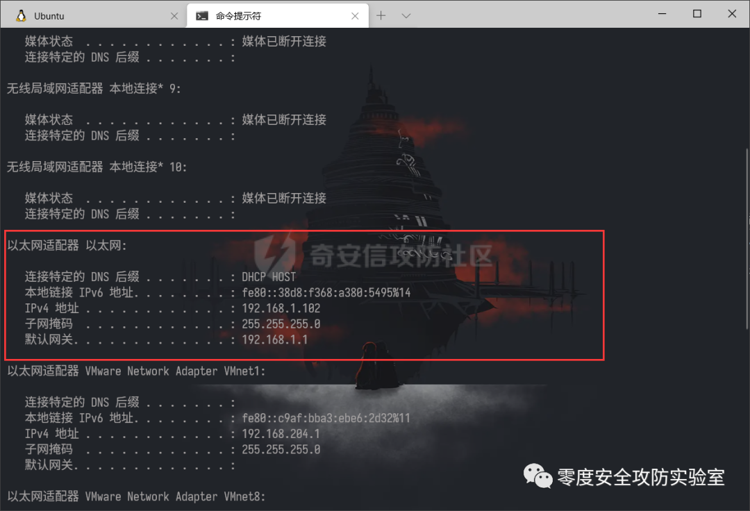 首先我们需要设置好抓包环境,先通过ipconfig查看我们当前 ip,这里我用的是以太网,也就是插着网线;如果是连着 WIFI,则找对应的即可