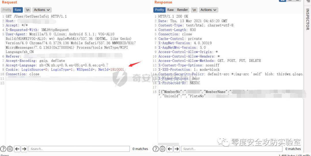 下面案例举例一个通过 Cookie 中的参数进行鉴权的漏洞,可以通过修改NetId中的值来遍历获取用户信息。此类漏洞的挖掘在鉴权处的源码,审计时可以着重审计其验证流程