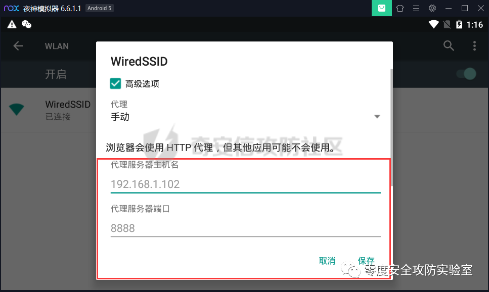 打开夜神模拟器,在 WLAN 选择手动代理,并设置代理地址和代理端口,和 burpsuite 对应