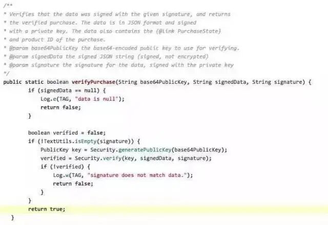 Google Play 的应用内购买机制的实现上存在的漏洞,在用户在Android 应用内购买某些数字资产时会从Play市场获取是否已经付费的验证数据,对这块数据的解析验证的代码存在逻辑问题,导致攻击者可以绕过验证不用真的付费就能买到东西。验证相关的代码如下: