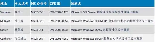 最古老的内存破坏类型。发生在堆栈中的缓冲区溢出,由于利用起来非常稳定,大多可以导致执行任意指令,威胁很大。此类漏洞历史非常悠久, 1988 年著名的Morris 蠕虫传播手段之一就是利用了finger 服务的一个栈缓冲区溢出漏洞。在2008 年之前的几乎所有影响面巨大的网络蠕虫也基本利用此类漏洞,汇总情况可以见下表: