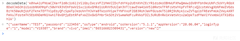 明文:{"userName":"TEST'","passWord":"123456","osType":"android","osVersion":"5.1.1","appVersion":"20.06.04","loginType":"1","model":"V1938T","brand":"vivo","imei":"865166023309431","version":"new"}