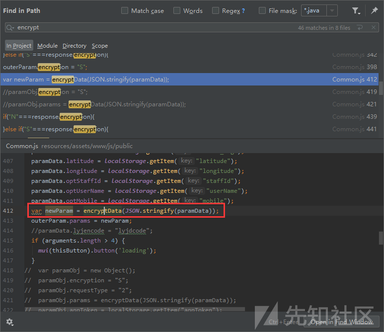 根据经验,先搜索Encrypt、Decrypt等关键字,发现在Common.js中有一个encryptData函数