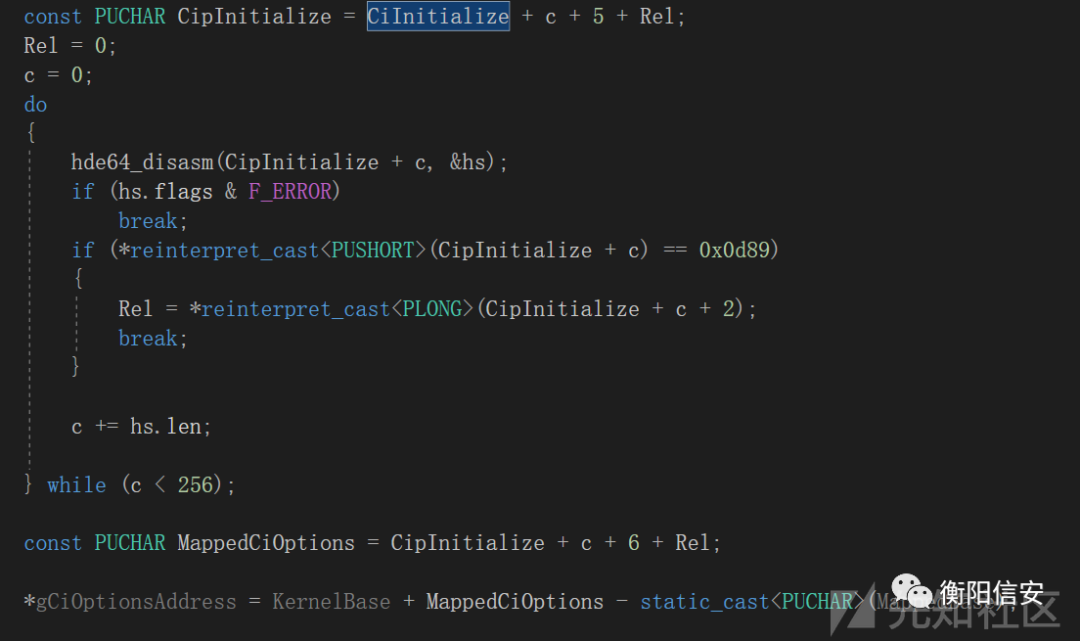 在CipInitialize中存在 mov cs:g_CiOptions, ecx,可以拿到g_CiOptions在内核的地址,即可以计算出偏移地址。