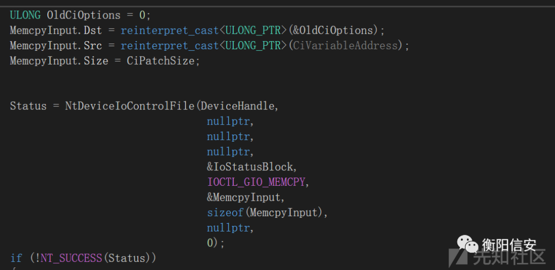 } GIOMEMInput, *PGIOMEMInput;NtDeviceIoControlFile(DeviceHandle,nullptr,nullptr,nullptr,&IoStatusBlock,IOCTL_GIO_MEMCPY,&MemcpyInput,sizeof(MemcpyInput),nullptr,0);