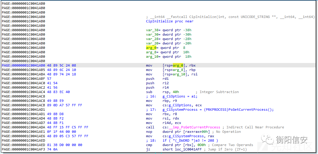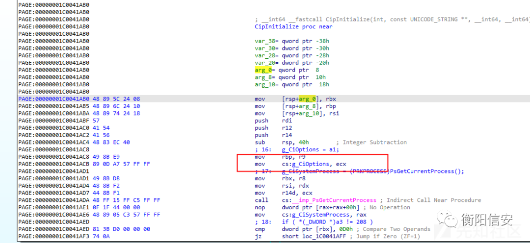 而在CipInitialize函数里面,都是一样的流程,都是获取mov cs:g_CiOptions, ecx。