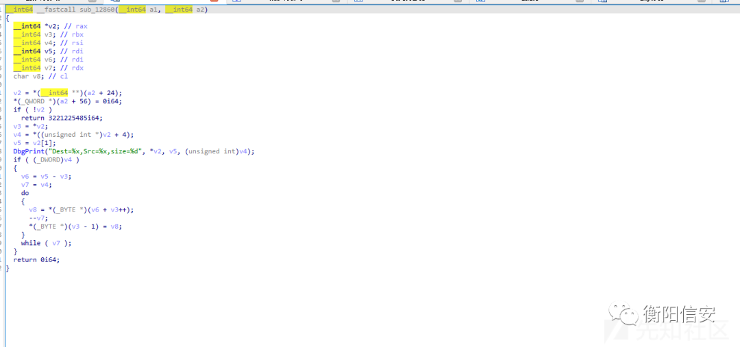 DbgPrint("Dest=%x,Src=%x,size=%d", *v2, v5, (unsigned int)v4);