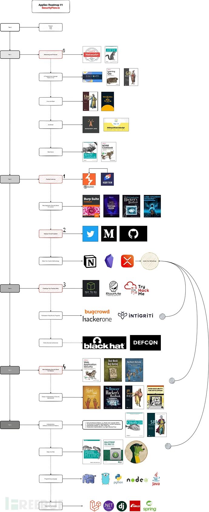 概述总结:第 0 层第一层网络和协议编程语言Linux 和 BashJavascript网络服务器第二层实践学习面向青少年的 Web 应用程序安全书籍保持更新制定自定义方法第 3 层挑战你的实践技能参与漏洞赏金计划关注安全会议更新您的方法论第 4 层面向中介的 Web 应用程序安全书籍第 5 层理解软件架构模式深入网络编程语言深入框架结论
