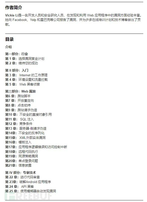 最后但同样重要的是,我们强烈建议您阅读Vickie Li的Bug Bounty Bootcamp。这是应用程序安全方面最好的书籍之一,因为它解释了各种漏洞利用和缓解措施,以及导致问题的易受攻击代码。