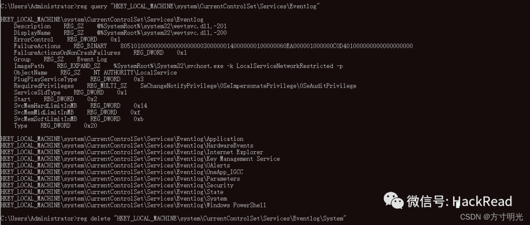 # 查询要禁用的注册表reg query "HKEY_LOCAL_MACHINE\system\CurrentControlSet\Services\Eventlog\"# 删除对应的注册表reg delete "HKEY_LOCAL_MACHINE\system\CurrentControlSet\Services\Eventlog\System" /f# 重启Windows Event Log(EventLog) 服务