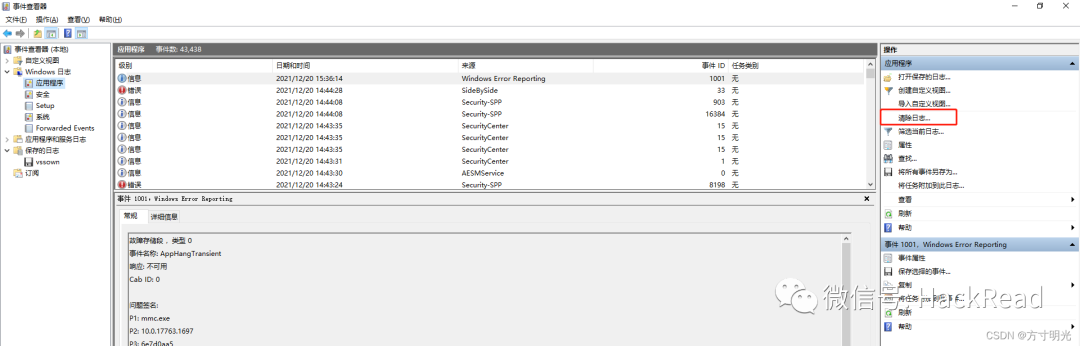 开始→运⾏,输⼊ eventvwr 进⼊事件查看器,右边栏选择清除⽇志