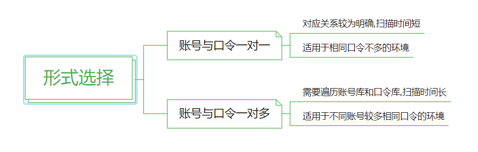 - 由于实际场景的调整,不同账号的重复弱口令情况增加,可适当调整为账号与口令一对多的形式进行检查当次扫描的环境单一,涉及的人员、 应用较少,可能的口令组合较少,可筛选调整为账号与口令一对一的形式