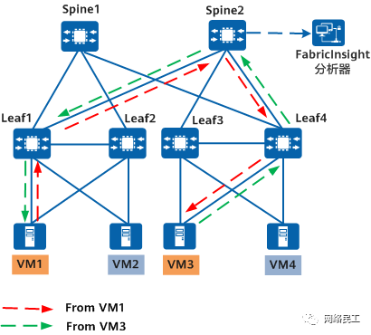 智能流量分析可以应用在在复杂的网络环境中,便于运维人员进行直观的网络管理。如下图所示,企业的数据中心部署了不同的业务,某应用部署在VM1和VM3上。承载该应用的某条业务流在VM1与VM3之间往返方向的路径相同,此路径上的每台交换机都可以捕获该业务流的双向流量。现运维人员想要对该应用流量重点监控,可以从上述路径经过的交换机中任意选取一个或多个交换机部署智能流量分析功能,对业务流进行监控和分析。一旦发现丢包、时延过大等异常,可以进行快速准确的故障定位。并且,可以将分析结果发送给iMaster NCE-FabricInsight网络流量分析工具进行进一步分析和展示。每日坚持学习与分享,觉得文章对你有帮助可在底部给点个“再看”