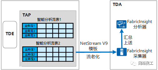 智能流量分析功能支持用户在设备侧查看TAP分析出的业务流特征信息,然而要获得可视化的、用户界面友好的分析结果,还是需要将流表发送给TDA处理。目前TDA仅支持分析器iMaster NCE-FabricInsight。iMaster NCE-FabricInsight分为FabricInsight采集器和FabricInsight分析器两部分。如下图所示,包含流分析结果的智能流量分析流表首先会被存储在设备的缓存区中,当缓存区中的智能流量分析流表达到老化条件时,设备中的TAP将这些流表的统计字段添加到NetStream V9扩展模板中进行封装。经过封装后的输出报文由转发芯片进行路由查找转发,最终到达FabricInsight采集器。FabricInsight采集器收到智能流量分析系统输出报文后,会依据报文源地址等报文信息对业务流特征信息进行汇总,并上送给FabricInsight分析器,完成流特征信息的最终处理和展示。