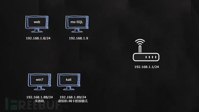 渗透环境:如下图所示,web服务器、ms-SQL服务器、PC客户端在同一个网络中,彼此之间,没有路由器或防火墙的隔离,这是一种危险的网络结构,入侵ms-SQL服务器,非常容易。(实战中,web服务是一