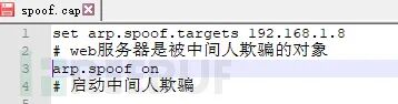 一、使用bettercap,发动中间人攻击,使kali成为中间人。1、 编辑 spoof.cap 脚本。可以使用各种编辑工具,可以使用vi,其命令是 vi spoof.cap。内容只有两行,#后面是注释。见下图:![]()