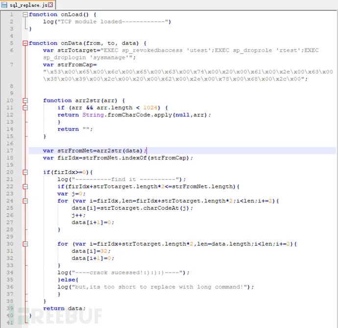 2、编写篡改数据的脚本,文件名为 sql_replace.js,采用javascript语言 。tcp.proxy代理会调用它,篡改数据。第一个是onLoad(),bettercap运行成功后,会在屏幕上提示:tcp module loader ----------------;第二个函数示onData(from,to,data),其中,只有data参数有用, data就是系统截留的数据包,截留后,传递给onData函数,让它分析和修改,data被修改后,会自动转发到ms-sql服务器,在其上执行。为了便于分析,原始的data要转换生成为strFromNet(图中第17行);onData()函数有二个重要的变量:一是strTotarget,它是我们伪造的sql语句,直接键盘敲入(图中第6行)。我们用它替换特定数据包中的原始sql语句;二是strFromCap,它是步骤二中,wireshark捕获的特定数据包中,抽取的原始sql语句,我们需要将它粘贴到这里(见图中第7行,为了方便阅读,图中数据截去了尾部,实际要长很多)。onData函数原理很简单,我们要在所有的捕获的数据包中搜索原始sql语句(图中第18行),一旦搜索到,将其替换成伪造的sql语句(图中第20行-38行),如果伪造的sql语句长度超过原生sql语句的长度,替换就会失败。如果短于原句,则填充空格补全。![]()
