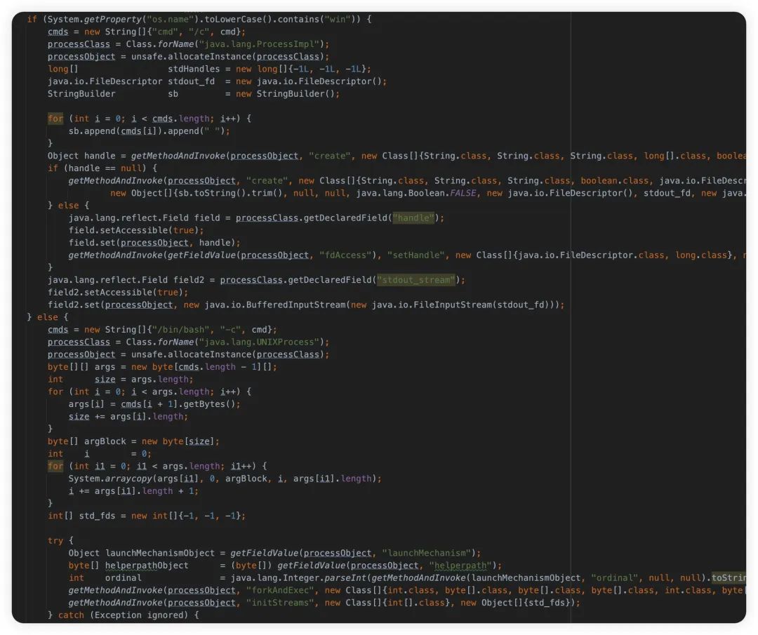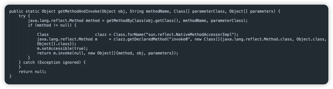 例如通过反射调用 native 方法来对命令执行的防御进行绕过: