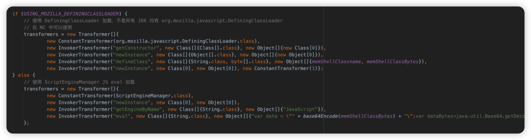 在不出网的情况下,可以通过 com.sun.org.apache.bcel.internal.util.ClassLoader.loadClass()、org.mozilla.javascript.DefiningClassLoader().defineClass()、new ScriptEngineManager().getEngineByName("JavaScript").eval() 的方式写入 JS 进行恶意类的打入,一键利用内存马。