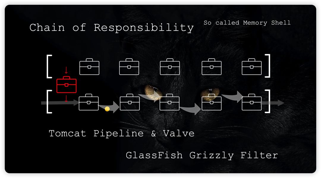 3. 系统关键位置的检测:有些检测工具可以获取关键位置的信息,并辅助人工排查,例如部分工具获取系统内全部 Filter 型内存马,并进行展示。此时可以通过挖掘非常规内存马的方式来进行规避,在之前我分享的关于 JavaWeb 内存马的 PPT 上层提到过,在 web 请求处理过程中,全部使用职责链设计模式的组件,都能用来作为内存马的挖掘利用方向,因此在各个 web 中间件中,再挖掘一种新的内存马也并非难事。
