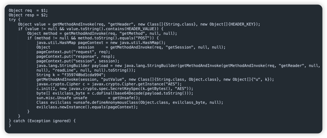 在内存马的实现上,则是通过向目标环境不落地的注入一个 Javassist 依赖 jar,并动态修改目标关键类,注入恶意逻辑,实现 Agent 马的动态修改,例如下图是实现了一个对 ApplicationFilterChain 的 doFilter 方法进行 Hook 的逻辑,实现冰蝎内存马的注入,并从服务器 dump 出来的 class。