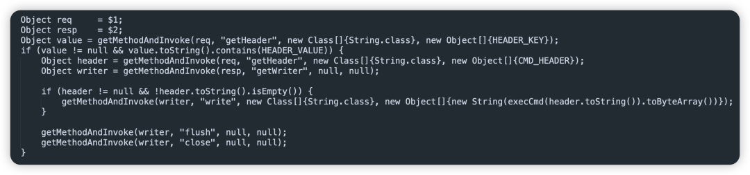 因此,我这里将关键逻辑最终抽象成一个相同的方法,这个方法的前两个参数分别是 Request 和 Response 对象,无论是命令执行、冰蝎、哥斯拉等等,都可以在这个方法下注入自己的逻辑。对于不同的中间件,由于封装和实现和不同,在进入关键逻辑前进行额外的判定以及处理,使最终处理逻辑一致。
