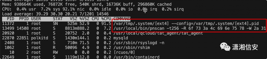 使用busybox可以发现一个是挖矿进程,另一个是pnscan扫描进程。直接kill进程后会马上再起一个,所以用busybox先把源文件删除后再杀进程。