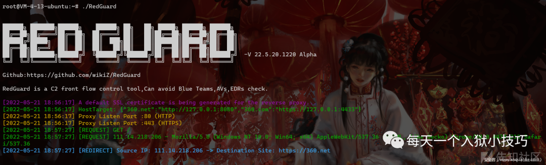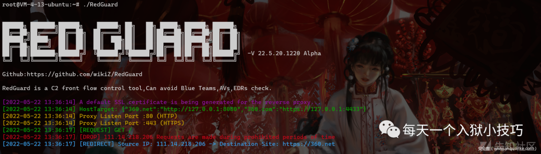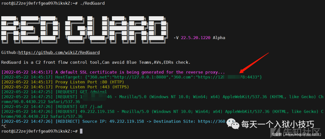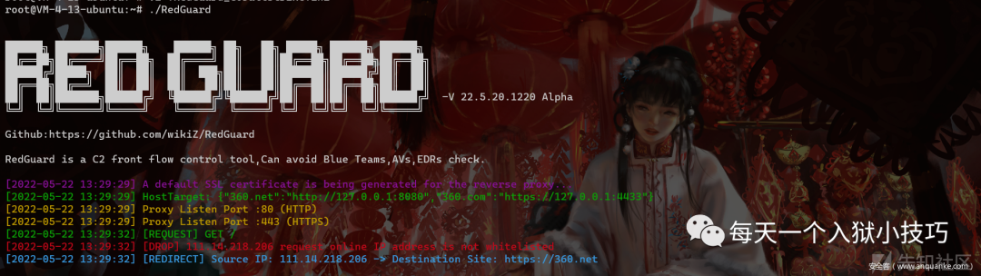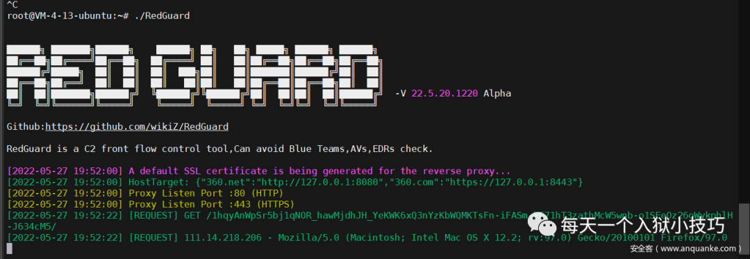 这里为了方便展示输出效果,实际使用可以通过nohup ./RedGuard &后台运行。