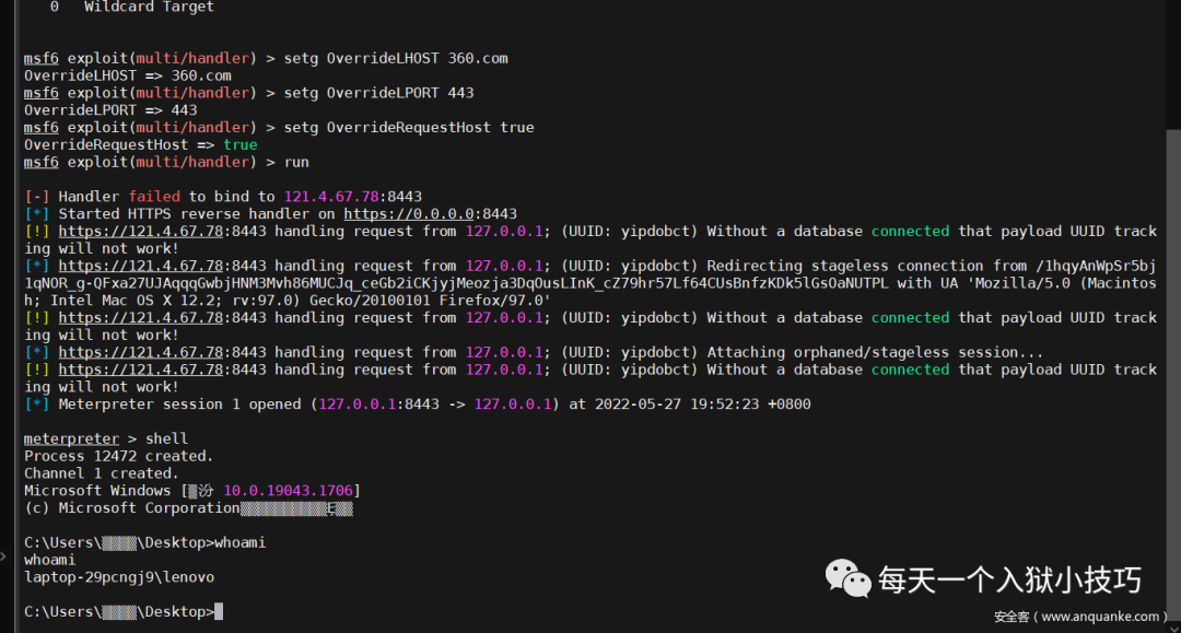 默认情况下,Metasploit 将传入请求的Host标头值(如果存在)用于第二阶段配置,而不是LHOST参数。因此,将生成阶段配置,以便将请求直接发送到您的隐藏域名,因为 CloudFront 在转发请求的Host标头中传递您的内部域。这显然不是我们所要求的。使用OverrideRequestHost配置值,我们可以强制 Metasploit 忽略传入Host的标头,而是使用LHOST指向原始 CloudFront 域的配置值。