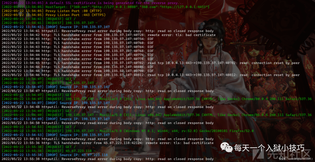 如果直接对反向代理的端口进行访问,则会触发拦截规则,这里通过输出的日志可以看到客户端请求根目录,但是因为其请求过程未