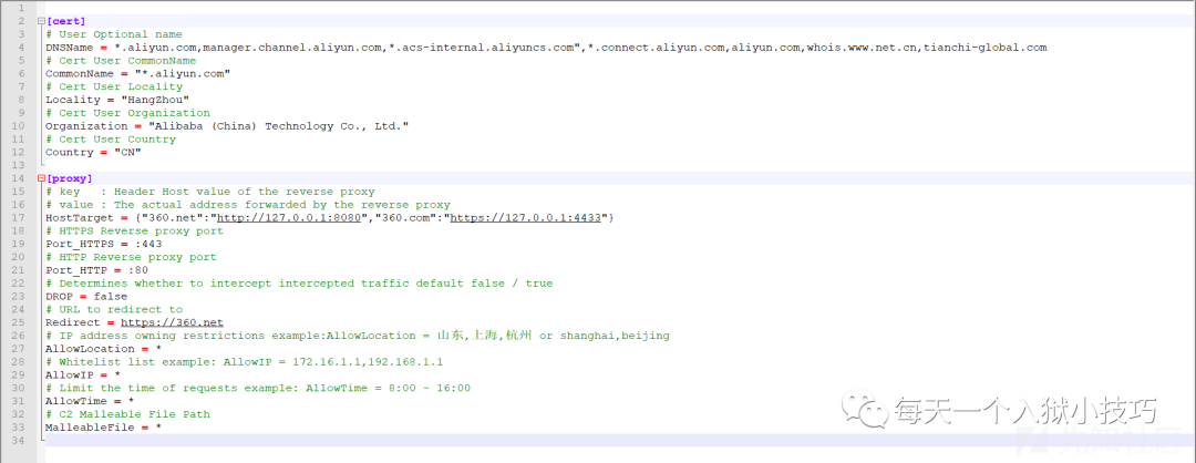 cert的配置选项主要是针对样本与C2前置设施的HTTPS流量交互证书的配置信息,proxy主要用于配置反向代理流量中的控制选项,具体使用会在下面进行详细讲解。