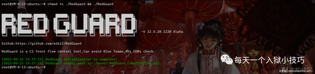 如下图,首先对RedGuard赋予可执行权限并进行初始化操作,第一次运行会在当前用户目录下生成配置文件,以实现灵活的功能配置,配置文件名:.RedGuard_CobaltStrike.ini。