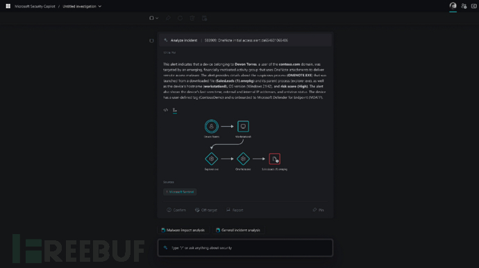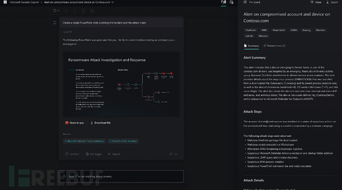 在微软安全的网页展示中,我们可以看到Security Copilot的强大。用户可以向 Security Copilot 询问特定时间段内的可疑用户登录情况;甚至可以使用它来创建概述事件及其攻击链的 PowerPoint 演示文稿;还可以接受文件、URL 和代码片段进行分析。同时,Security Copilot还提供了可视化的工具,安全人员能够让机器人一键生成演示文件,展示安全威胁的路径。