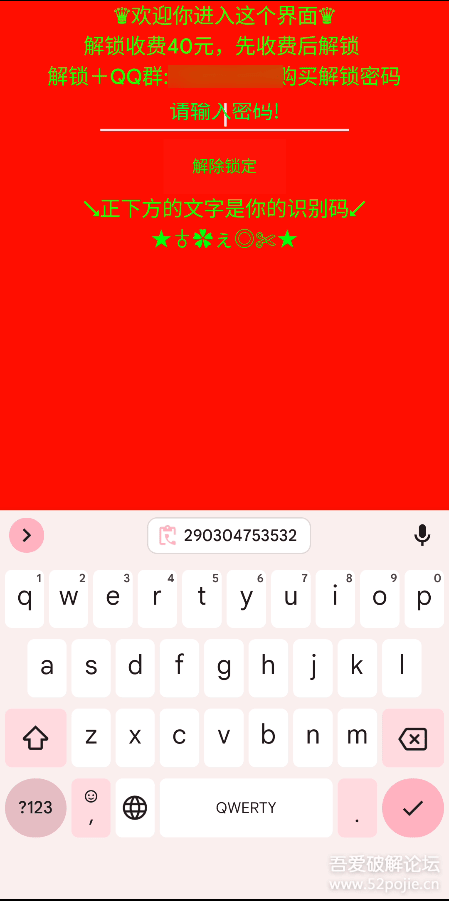 对于第一个锁机页面,其布局如图,我们需要点击大概60+次右下角的需要解锁加群按钮,然后蓝色按钮上方就会出现输入框。对于注册码的计算。我们需要先将识别码按上方代码中的注释对照表。按照图标-数字 一一对应,转化为注册码填入输入框中,之后点击蓝色按钮,可以通过第一层锁机界面来到第二层。如图中的★✄♬♬★௵啊,将其转换成与之对应的注册码为1422165。我们将该转换得到的数字填入上方代码中,运行脚本。紧跟输出Your password1 is :之后的就是第一层锁机的注册码。