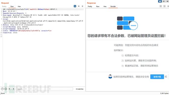 以DVWA+安全狗的环境为例,默认payload会被拦截: