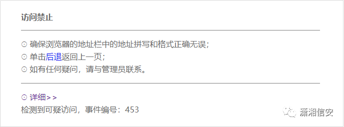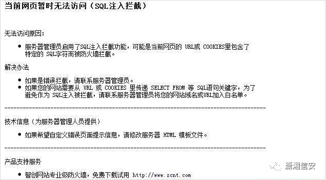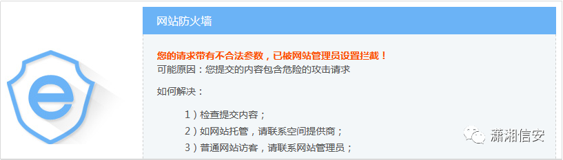 本文由:潇湘信安排版整理前言最近较为浮躁,无心写文。发一篇以前发过的文章,原来搜集整理了30个WAF的拦截页,后边又新增了一些,大家也别问了,只有图片,没有源码和特征。(1) D盾(2) 云锁(3)